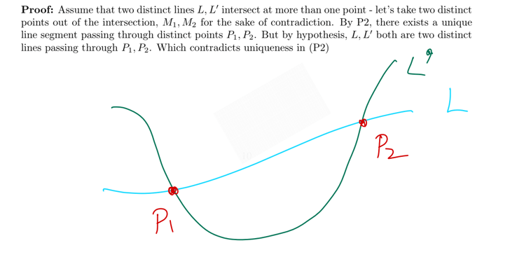(P2) Given two distinct points, there exists a unique line segment (and hence by postulate 1, a unique line) that contains the given two points